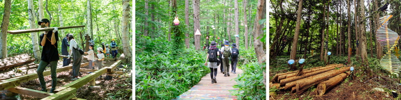 为了使森林中的植物不被踩踏,志愿者与苗场的各位在会场的森林中一起铺成的长约1.4千米的木制林间小道。