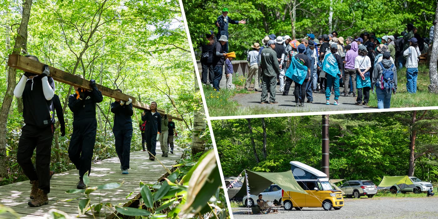 这条受积雪和强风影响的栈道正在进行维修和维护,以备富士摇滚音乐节之用,同时游客可在“栈道志愿者营地”享受自然风光。