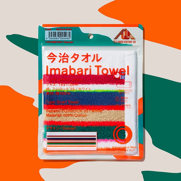 这是一款适合佩戴在脖子上的音乐节专用毛巾,采用了今治独特的高吸水性规格和Fuji Rock ’25的主要视觉图案。
